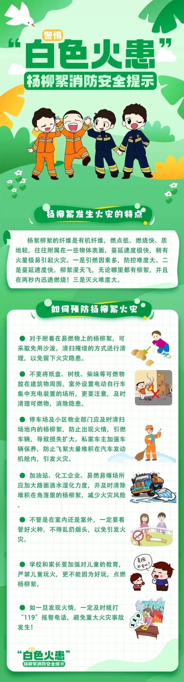 杨柳絮含有大量油脂,且表面所含碳纤维量较高,具有燃点低、蓬松易燃等特质,遇到明火特别容易发生燃烧,注意防火!
