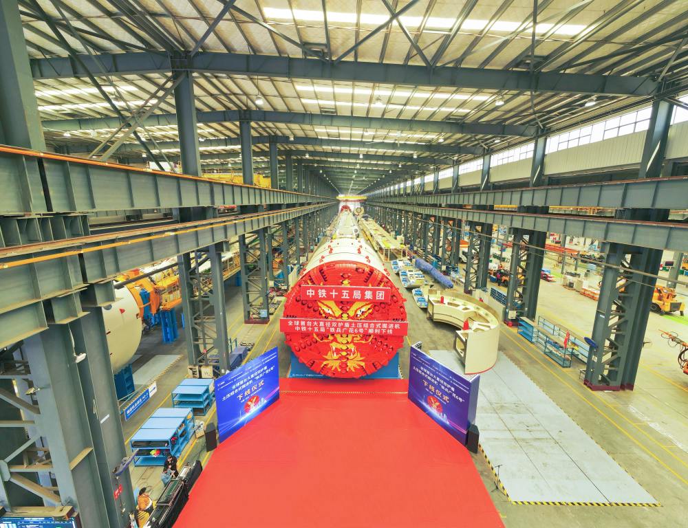当日,大直径双护盾土压组合式掘进机“铁兵广花6号”在位于湖南省长沙市的中国铁建重工集团长沙第二产业园下线。“铁兵广花6号”直径8.9米,总长131米,总重约1500吨,由中国铁建重工集团和中铁十五局集团联合打造,下线后将被应用于广州东至花都天贵城际项目京白区间施工。广花城际铁路再添施工“重器”。