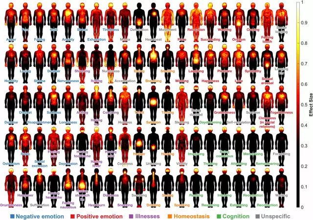 图尔库大学的神经科学家Lauri Nummenmaa领导的研究小组,先后通过两个实验制作了一幅“人类情绪身体地图”,这个地图显示了每个情绪和身体感觉的联系。