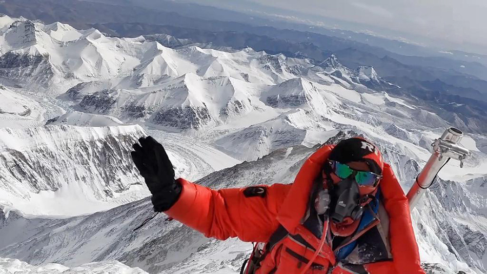 5月23日,科考登顶队员在珠峰峰顶展示第二次青藏高原综合科学考察研究旗帜。新华社 图