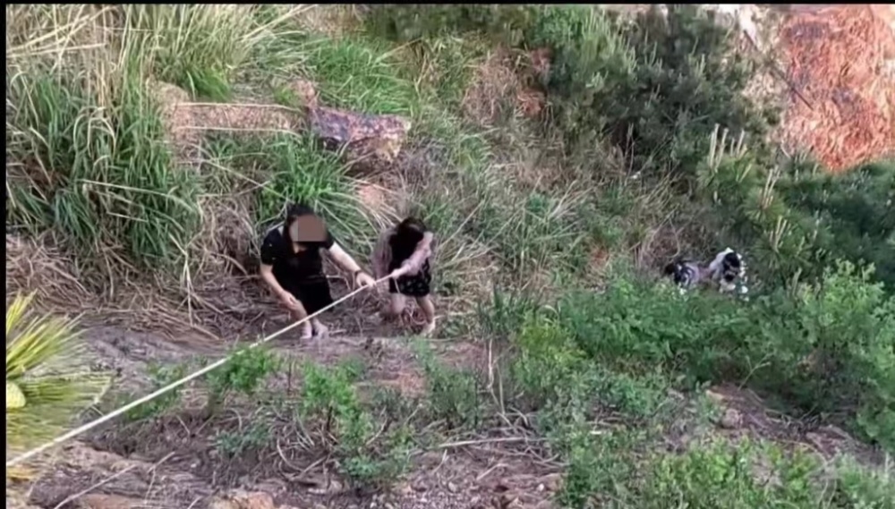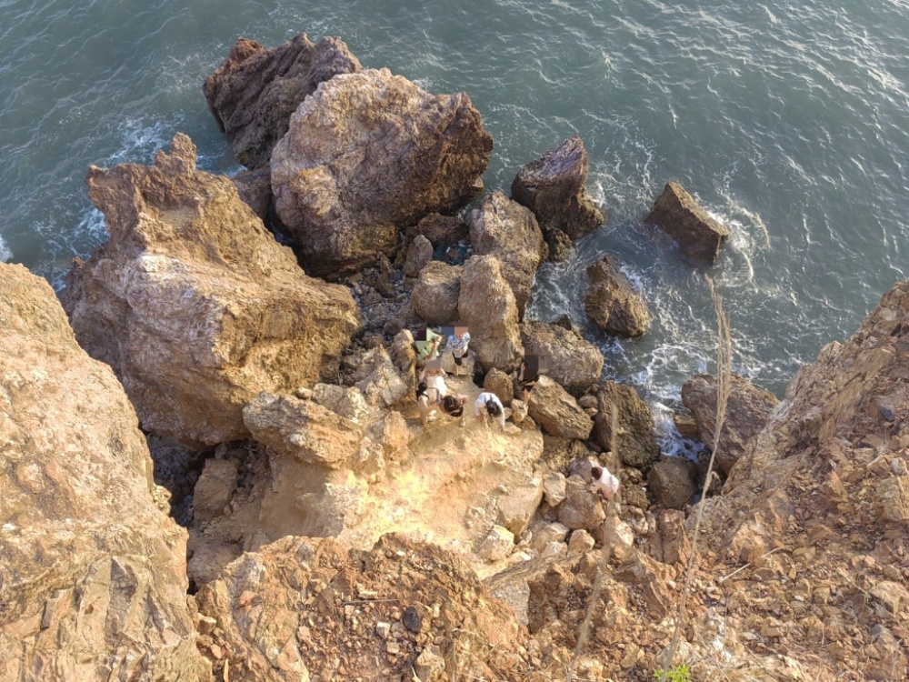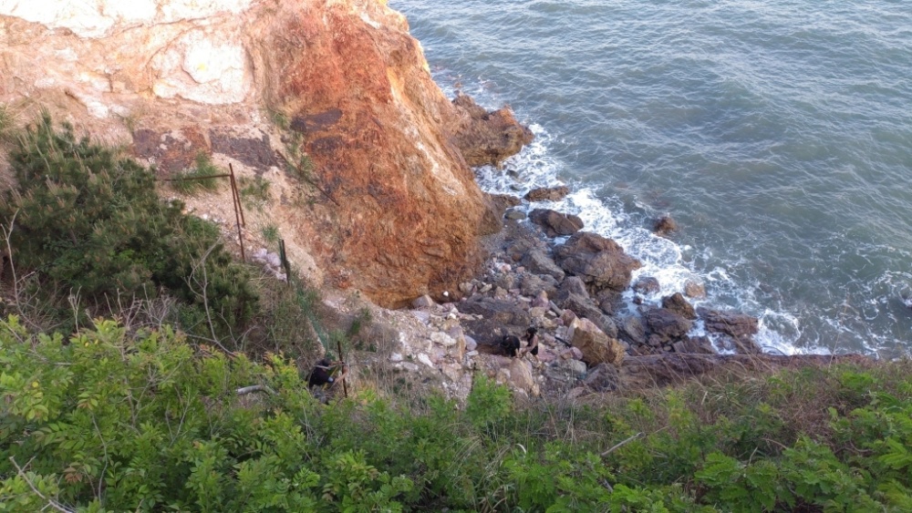为了尽快将被困游客转移到岸上,朱孝蒙从岸边翻过一座小山头,之后到达被困游客上方悬崖。“山头比较陡峭,小路上草木荆棘很多,我带着绳索到山头后,看到了他们,就让他们往东边高处回撤,这样可以上到山路返回。”朱孝蒙说,五六分钟后,救援队员万国平赶到,他们搭建了一个简易的绳索,王国平沿着绳索下到游客被困处,将被困者领着往上爬。