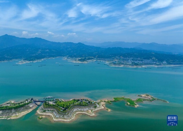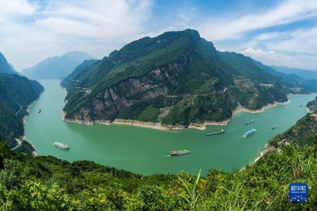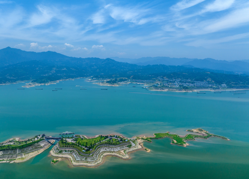 6月10日,船舶从湖北省宜昌市秭归县木鱼岛外沿水域驶过(无人机照片)。