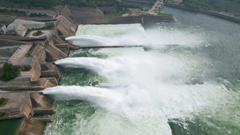 黄河小浪底水利枢纽开启3个闸门大流量下泄。新华社记者刘诗平 摄