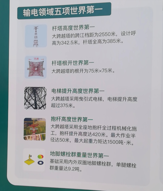 “我们组建了专业技术团队,攻克了超高铁塔组立、大张力跨江架线等一系列技术难关。”该工程业主项目经理陈兵介绍,工程建设期间,首次采用铸钢节点、环状钢骨构件、特强钢芯铝合金绞线等新技术、新材料,创下了组塔抱杆高度等五项行业内世界纪录。整体工程实现了百分百中国造。
