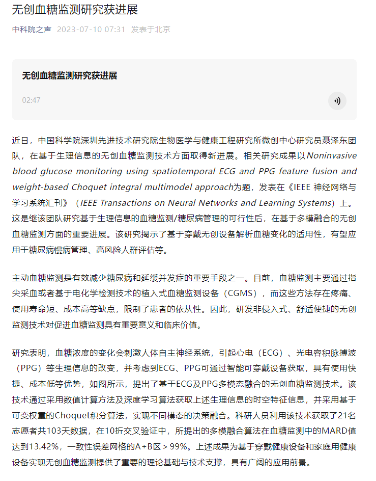 标题: 【颠覆性技术!】中科院宣布,无创测血糖有新成果,试验结果值已符合国标
