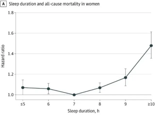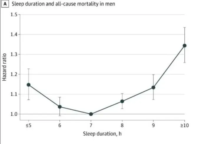 2021年一项发表在《美国医学会杂志》网络期刊上研究揭示了日本、中国、新加坡和韩国成年人睡眠时间与总体死亡率之间的关系,持续的睡眠不足和持续的睡眠过多都会导致死亡率升高,7小时才是“最佳睡眠时间”。