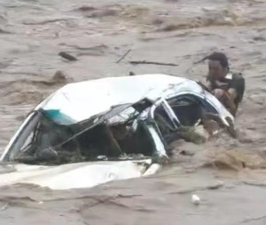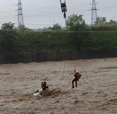 标题: 【赞】河北邯郸一男子连人带车被冲入洪水 消防员用吊车从空中将人救出