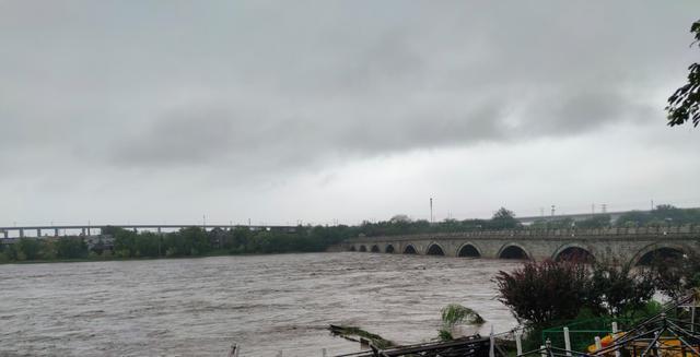 卢沟桥下水流湍急,水势较大,图片为7月31日下午5点的卢沟桥。