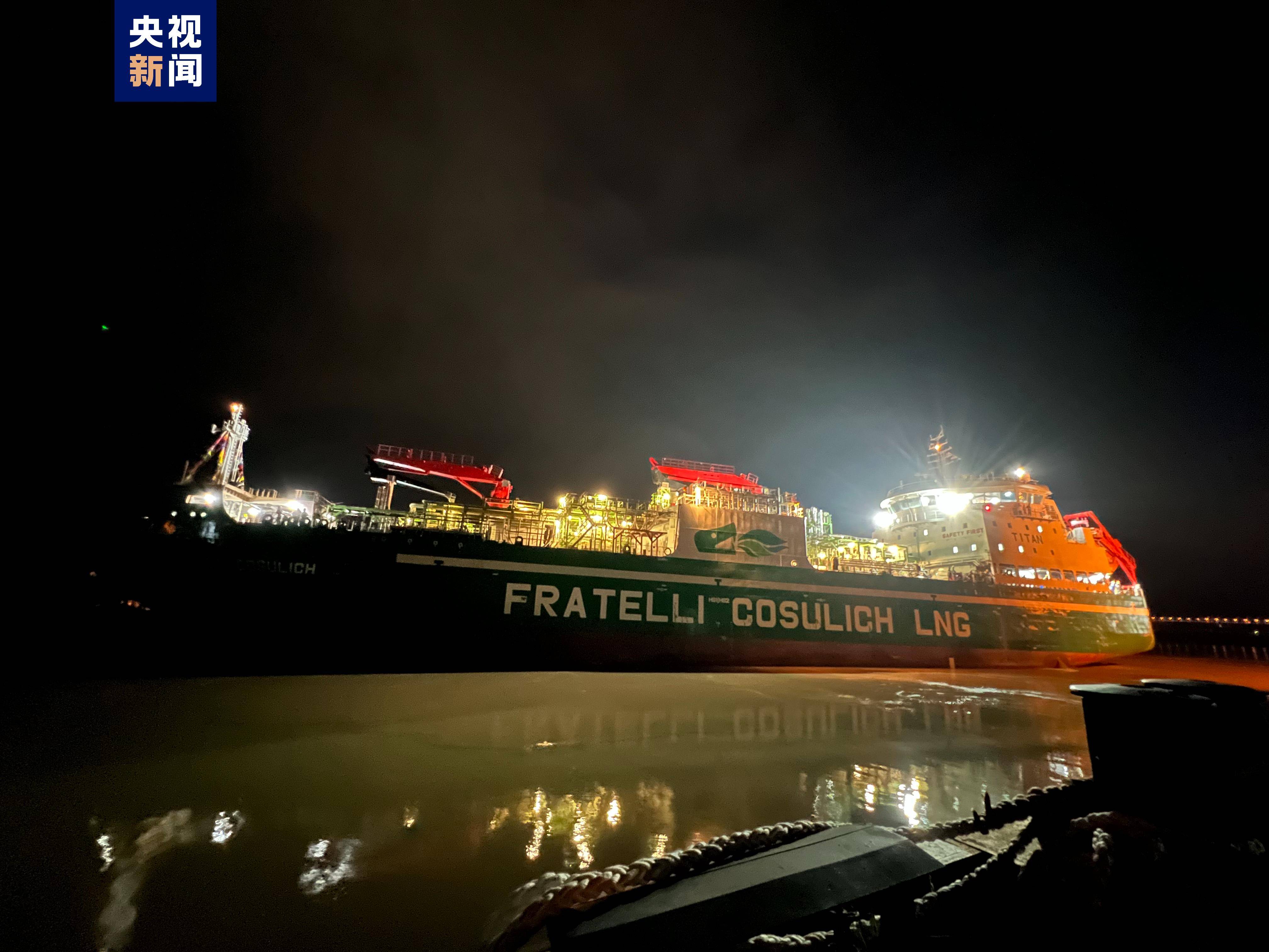 7日凌晨,中国自主设计建造的8200立方米LNG加注船从江苏启东出发,前往浙江花鸟山海域试航。江苏海事局供图。