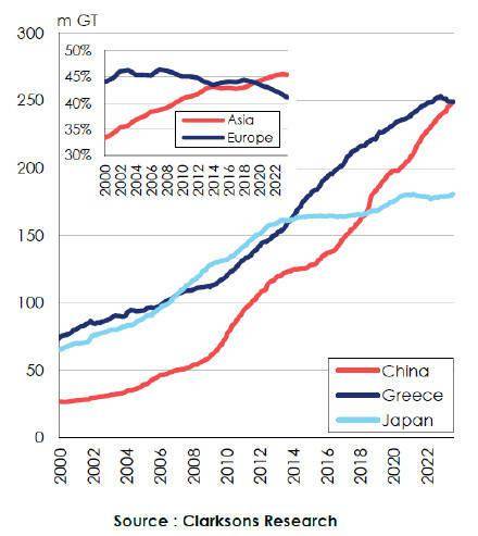 21世纪初,日本是按总吨位计的最大船东国,随后希腊在2013年超过了日本排名第一。随后2018年中国也超过了日本,开始了对希腊的“追击”。