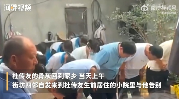 8月21日,据新黄河“河畔视频”报道,“他和落水者素不相识,却毫不犹豫地伸出援手。”8月18日,在安徽阜南,杜传友的骨灰回到家乡,当天上午,街坊四邻自发来到杜传友生前居住的小院里与他告别。