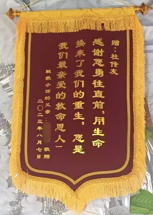 获救男童的父亲,为杜传友送来锦旗