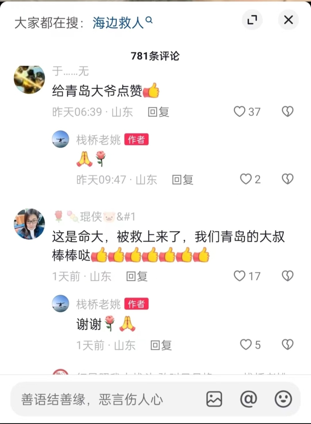 随着网友的热议,视频点赞量很快突破3000,网友留言近800条。面对网友的点赞,发布视频的网友“@栈桥老姚”也留言回应,“再一次感谢朋友们的赞,再一次感谢朋友们的关心与关注,谢谢朋友们的支持,我今年整70周岁了,还要加强锻炼,加油!”