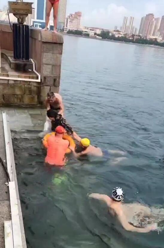 “他们拖着女游客,绕着游向附近的一个上岸的楼梯。当时我正好在楼梯口下边游泳,看到后我也迅速游了过去。帮着他们上岸,一起把女青年拖上来。”世宝特海上救生救援志愿者服务队队长时效杰告诉记者,在岸边等待的队员王文华将女青年扶着到岸上休息。