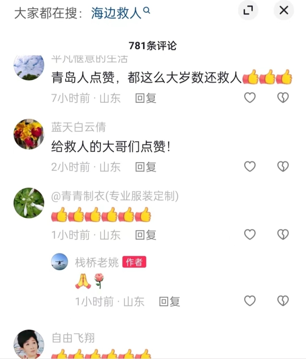 “给青岛跳水大爷点赞,他们是游客平安的守护者!”“这就是我爱青岛的原因,有这些人在就很踏实。”“都这么大岁数了还救人,老当益壮,真不简单。”视频发布后,立即引发广大网友热议和点赞。大量网友纷纷留言称,女游客被吓得脸“一点血色没有了”,“她真的好幸运,遇到一大帮好人。”