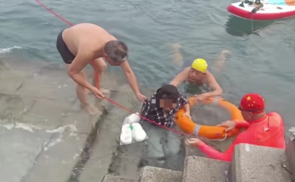 “今晨在青岛栈桥回澜阁做了件非常有意义的事情,救了一个落水者……”近日,一则青岛跳水大爷下海救人的视频在网上热传。据视频显示,一名中年女游客落入海中,两名身穿泳衣的青岛大爷游到其身边,女游客趴在一个救生圈上。岸上有人找来绳索,扔到海中,水中的一名大爷将绳索绑在救生圈上,之后,在岸上人员的帮助下,多名大爷将女游客救上岸。女子被救上岸后,身体没有大碍,坐在岸上休息,其随身携带的物品也被捞上来。该女子表示自己之所以落海,是因为坐在大坝上看风景,起身时太猛,头一晕就掉下去了。