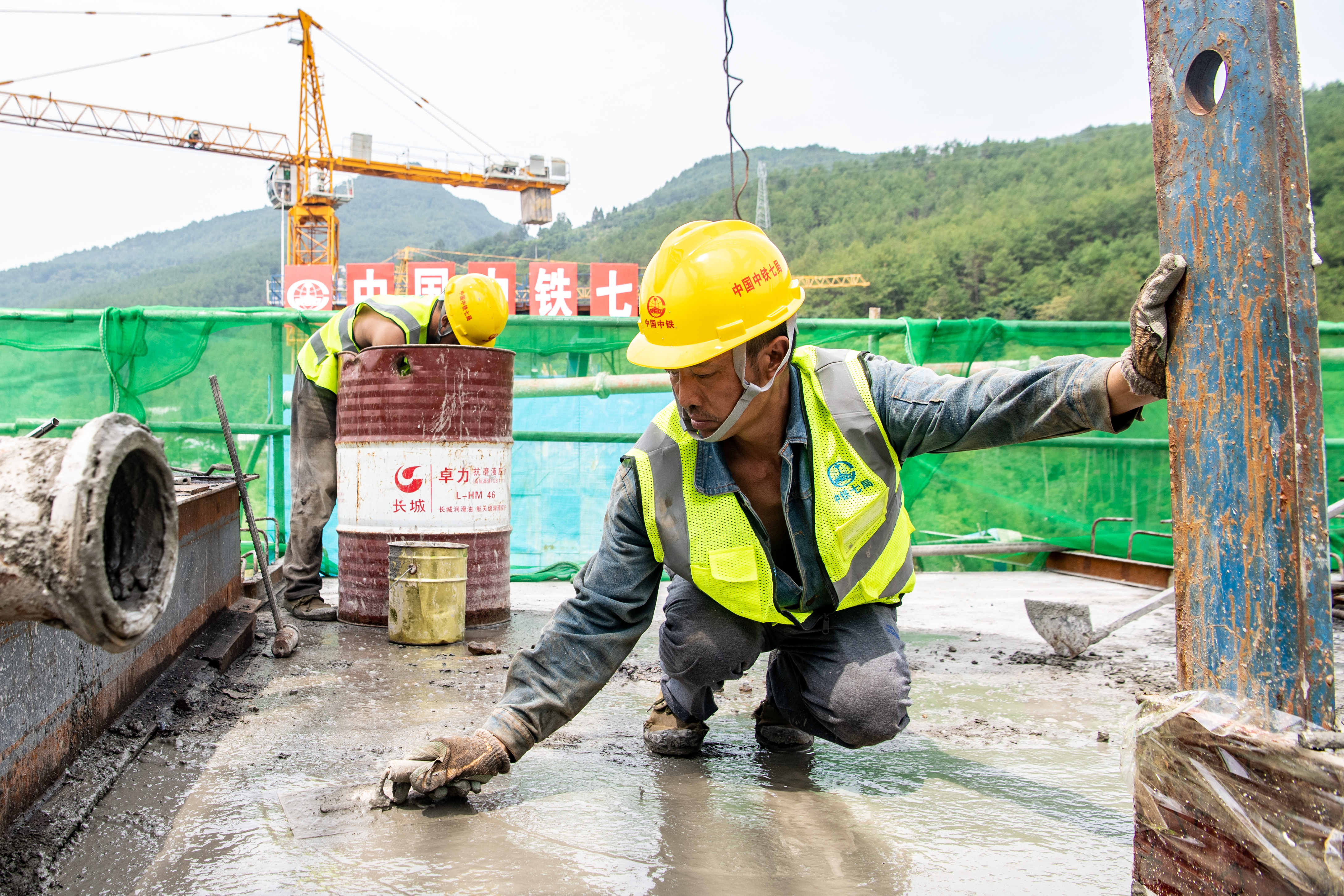 8月24日,工作人员在石梁河双线特大桥4号墩T构桥梁合龙施工现场作业。新华社记者 唐奕 摄