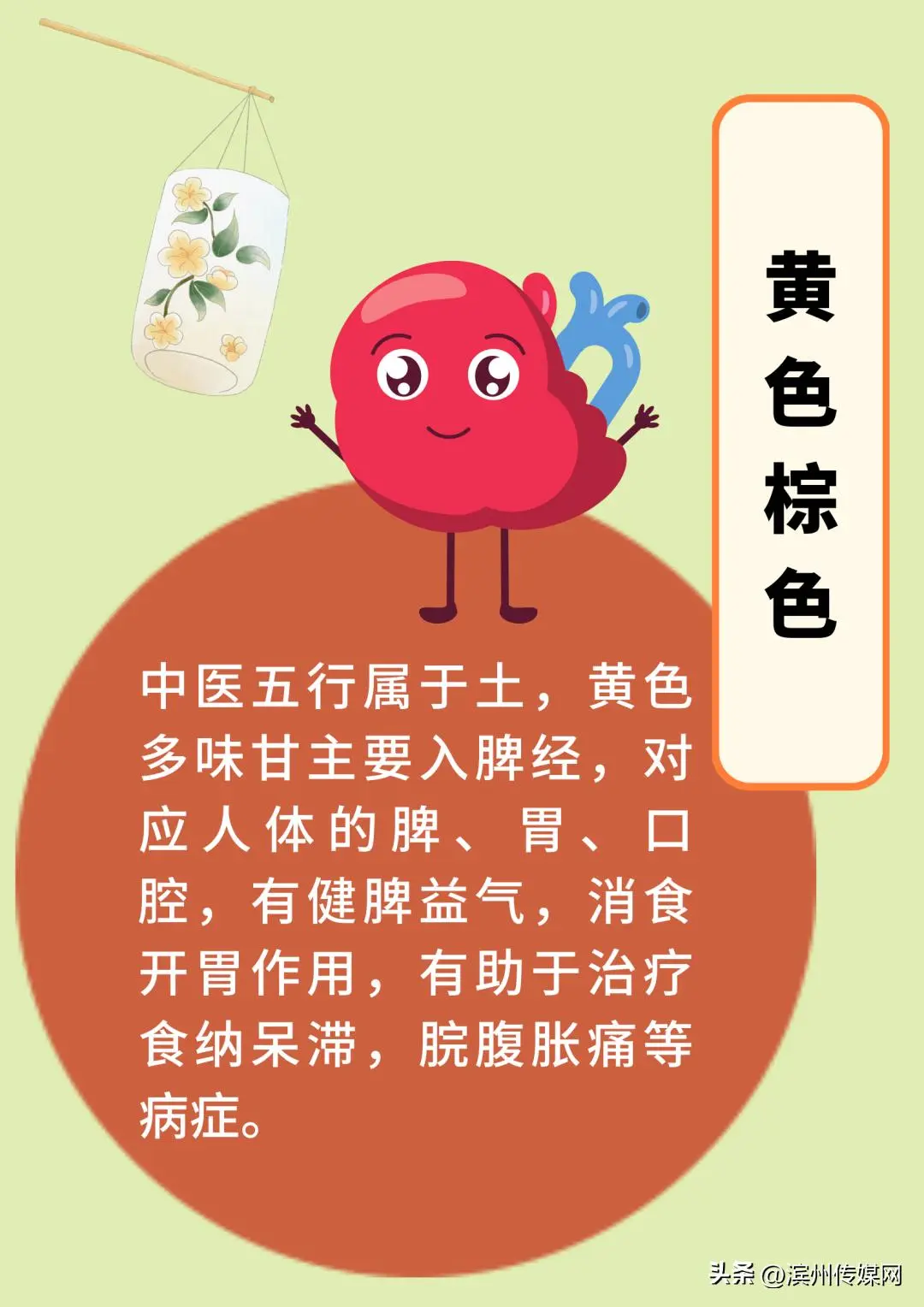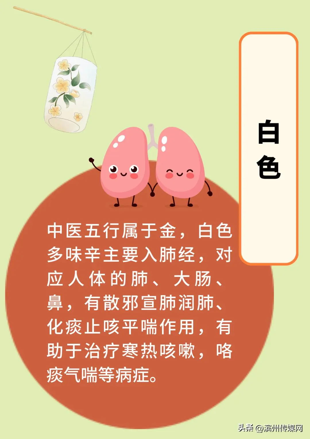 不同颜色的水果、蔬菜的归经功能主治各有不同。一般来说五行的金、木、水、火、土各以白、绿、黑、红、黄五色代表,人体脏腑五官等也按五行归类,例如::