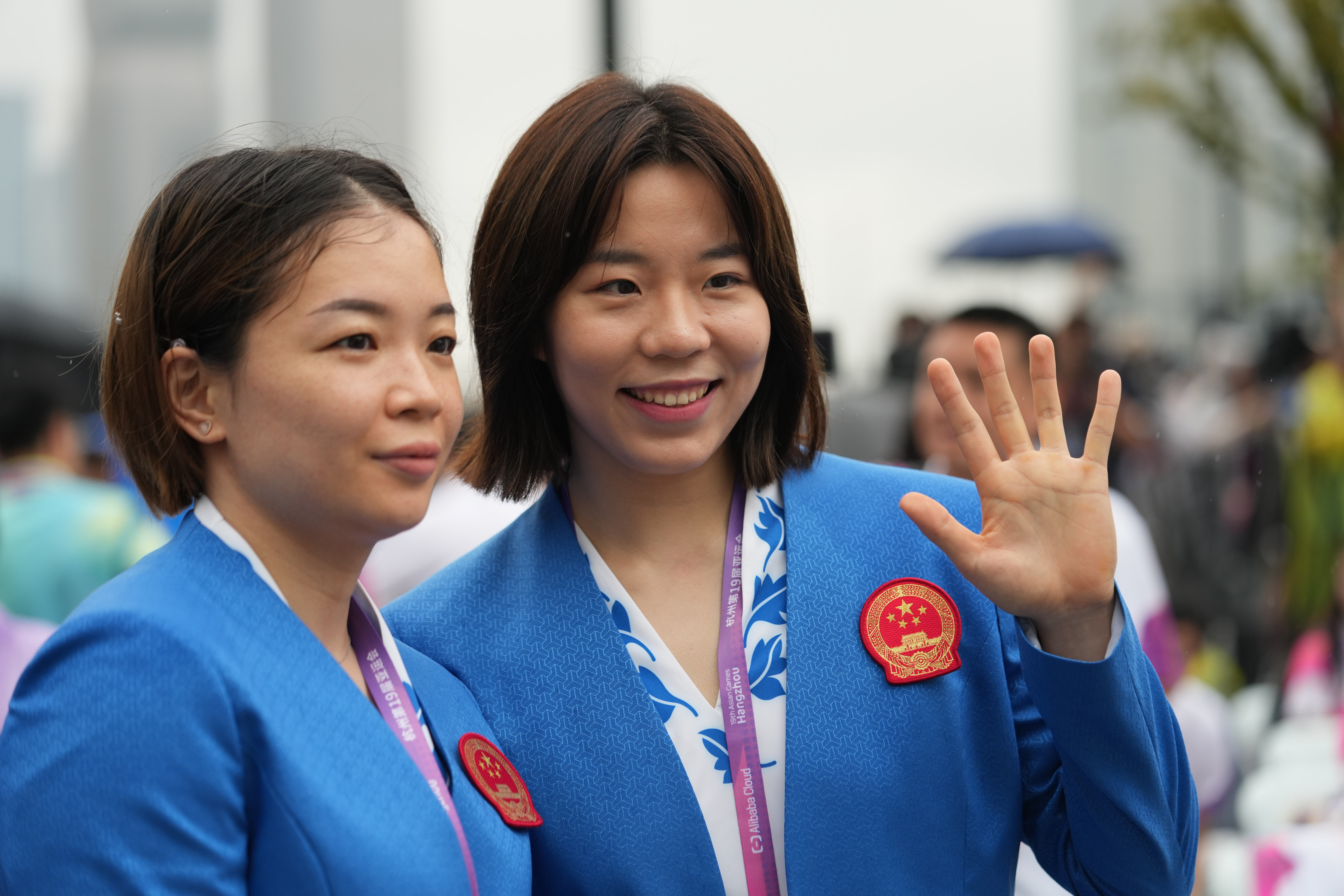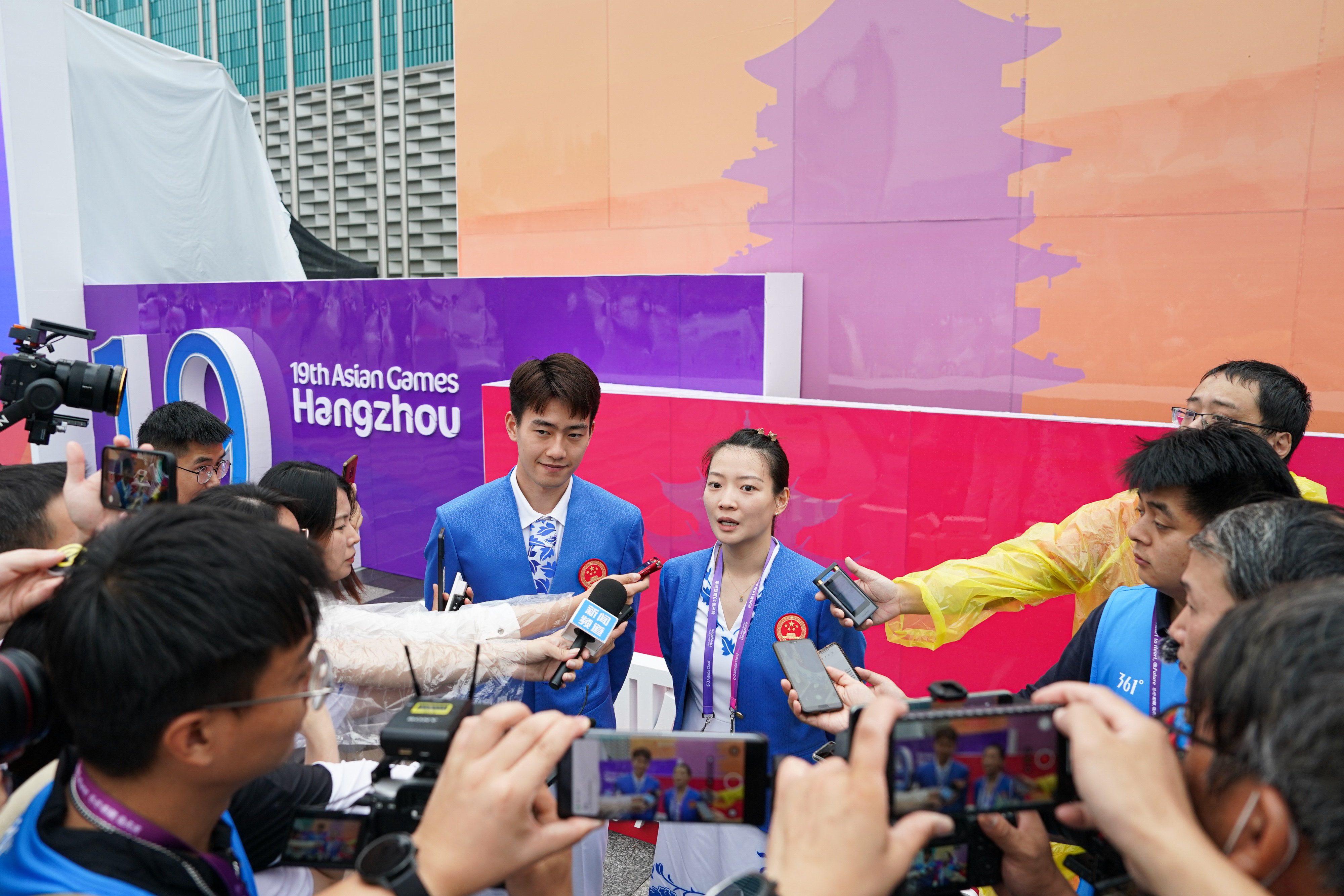 9月16日,中国体育代表团成员王昶(左)、黄雅琼在仪式后接受媒体采访。新华社记者 杜宇 摄