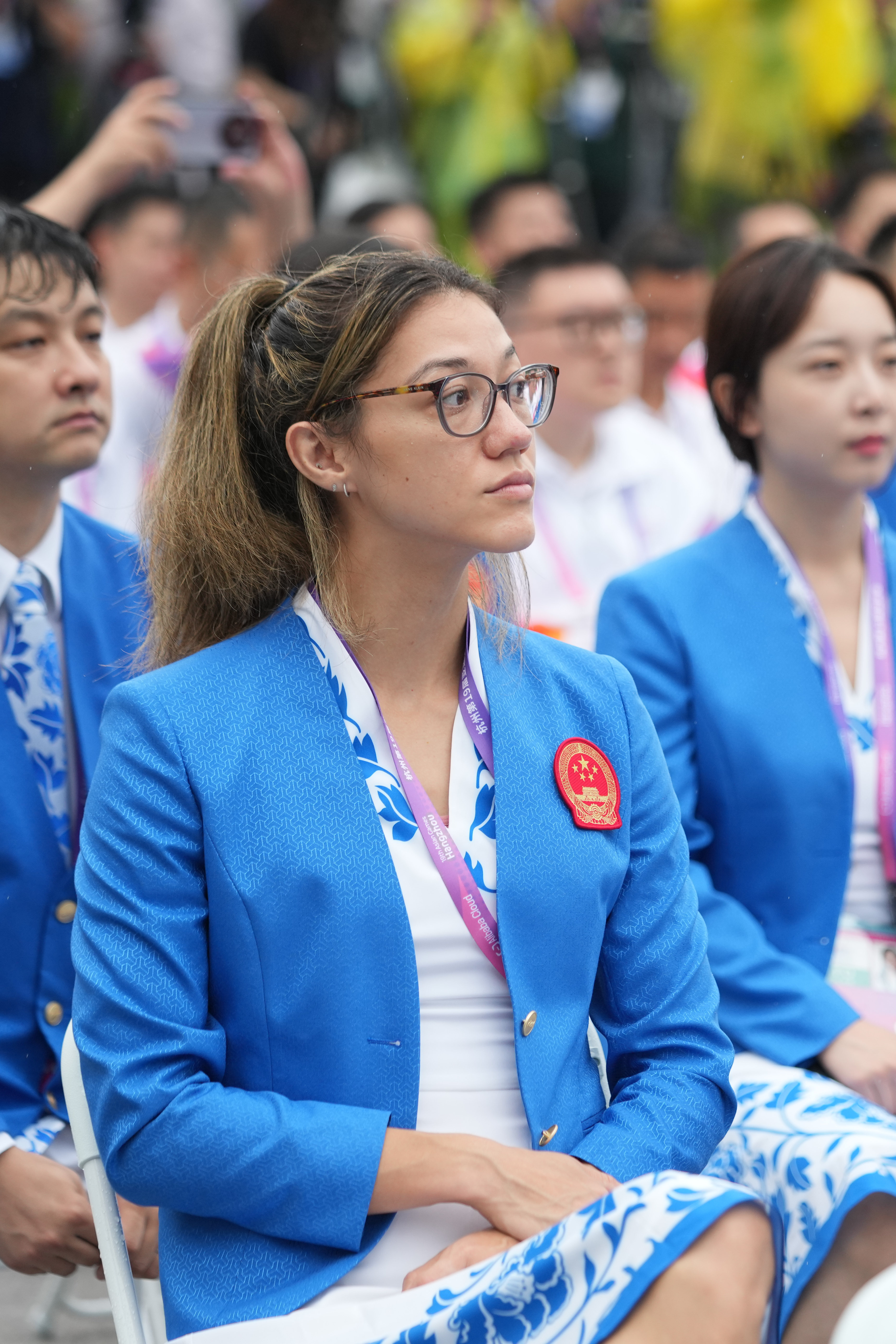 9月16日,中国体育代表团成员郑妮娜力(中)在仪式上。新华社记者 薛宇舸 摄
