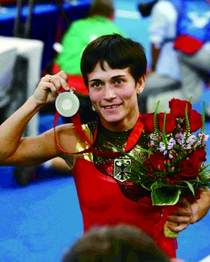 2008年北京奥运会,丘索维金娜展示女子跳马银牌 新华社图