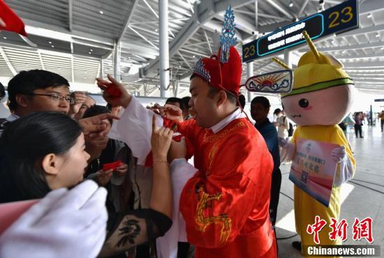 图为9月28日,“状元”迎接乘坐福厦高铁首趟复兴号智能动车组G9801次列车抵达厦门北站的旅客。中新网记者 张斌 摄