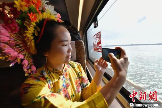 图为9月28日,乘坐福厦高铁首趟复兴号智能动车组G9801次列车的泉州“蟳埔女”正在拍摄窗外美景。中新网记者 张斌 摄