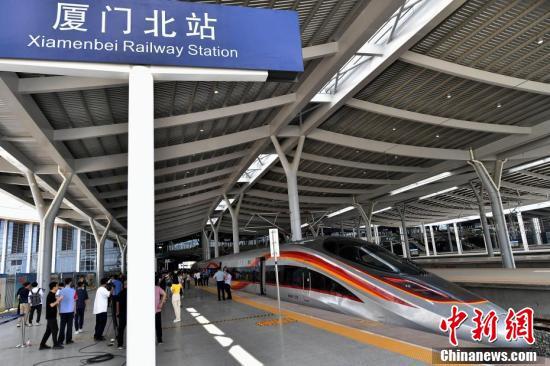 图为9月28日,福厦高铁首趟复兴号智能动车组G9801次列车抵达厦门北站。中新网记者 张斌 摄