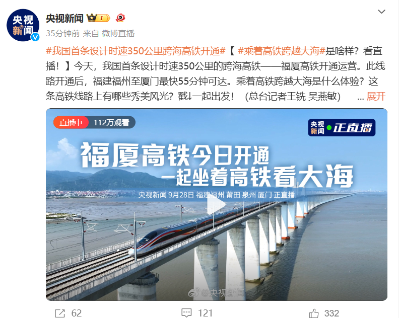标题: 【真棒】中国首条时速350公里跨海高铁开通 福厦形成“一小时生活圈”—2023-9-29