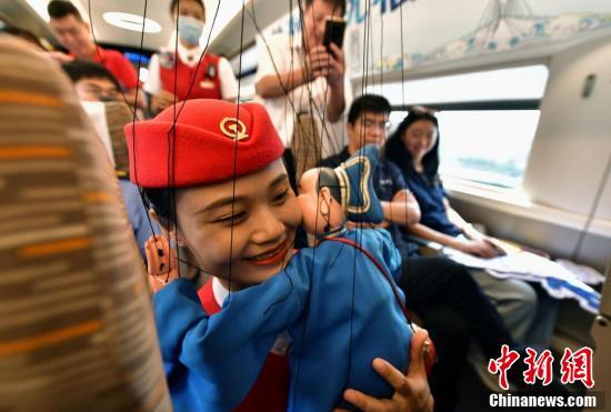 图为9月28日,福厦高铁首趟复兴号智能动车组G9801次列车乘务员在车厢内拥抱正在表演的提线木偶。中新网记者 张斌 摄
