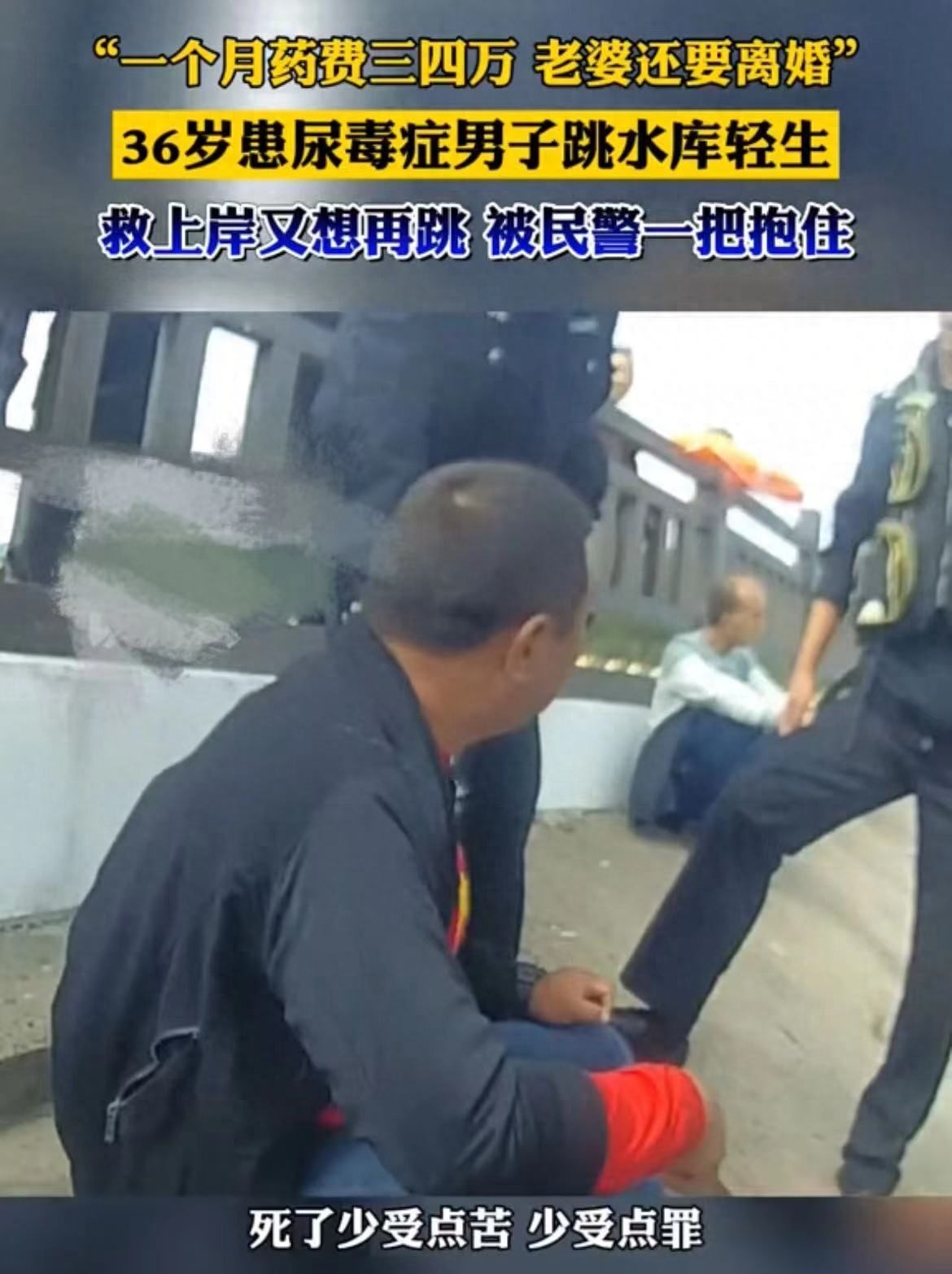 标题: 【网友热议】36岁尿毒症男子跳水库自杀,妻子每月只给500元要离婚—2023-10-12