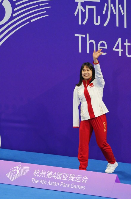 10月27日,蒋裕燕在颁奖仪式上。当日,在杭州第4届亚残运会女子50米自由泳S6级决赛中,中国选手蒋裕燕以33秒44的成绩创造新的亚残运会纪录并夺得金牌。新华社记者 才扬 摄