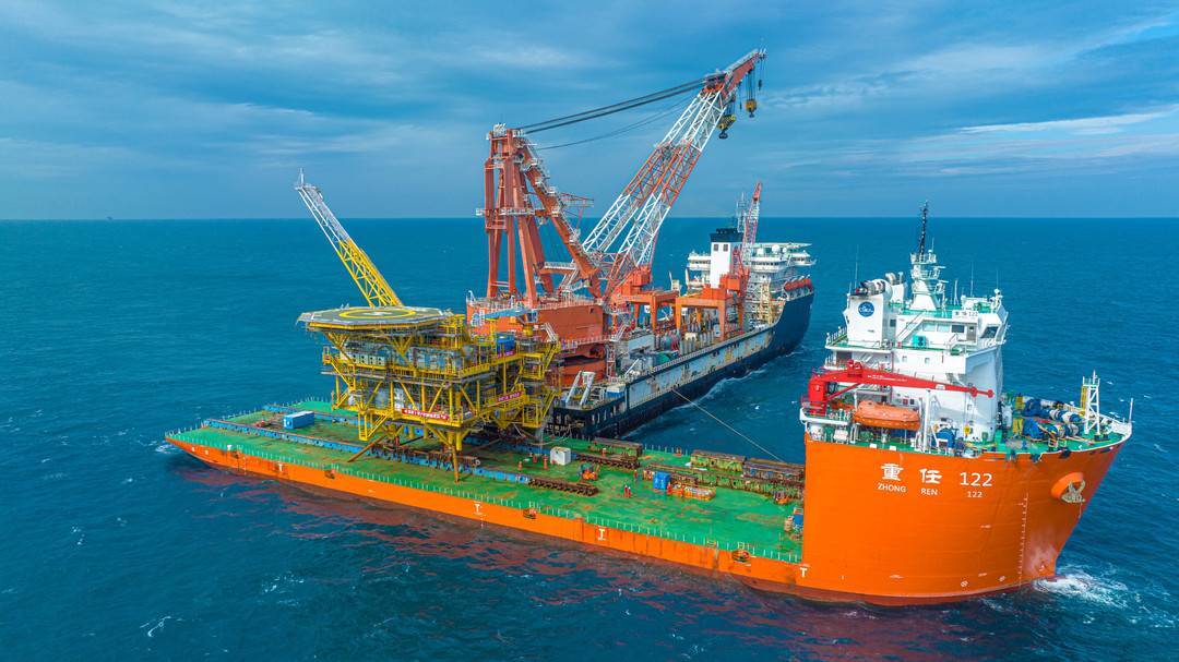 11月3日,乐东10-1气田生产平台完成海上安装,图为重任122船搭载乐东10-1气田上部组块靠近海洋石油201船。 (中国海油 供图)