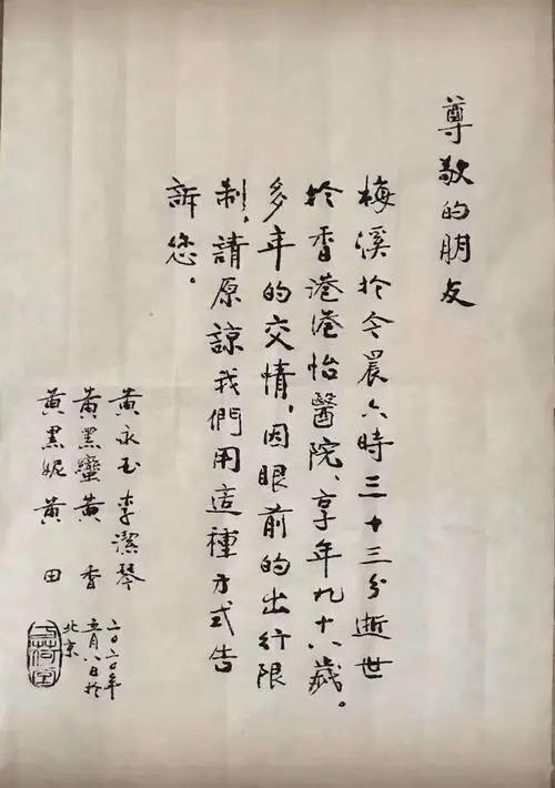 手写的讣告一般不超过100个字,特点是严肃庄重,使用的纸张一般为白、黄两色。