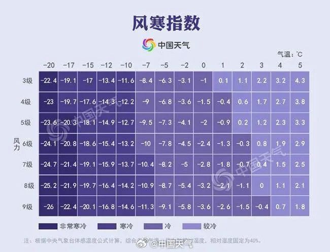 根据中央气象台的体感温度计算方法,当气温为5℃、相对湿度为40%时,如果刮起7级大风,体感温度为2.5℃,叠加9级大风时体感温度只有1.8℃,寒冷感直线上升。