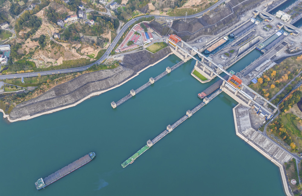11月24日,在湖北省宜昌市,船舶有序通过三峡船闸和升船机(无人机照片)。新华社发(王罡摄)
