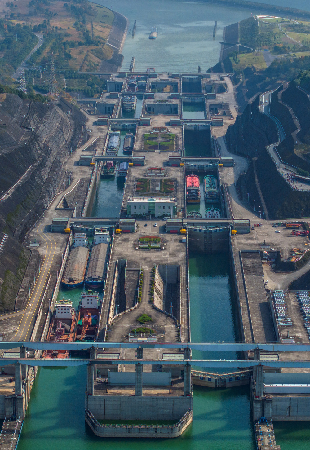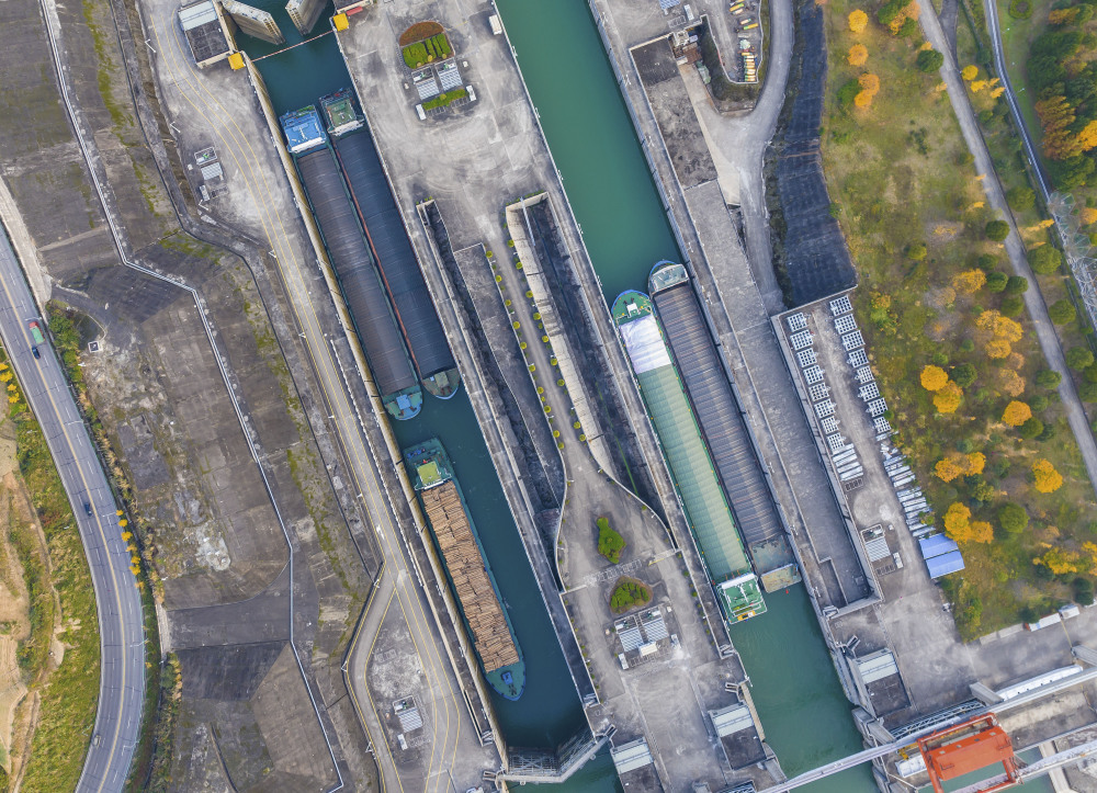 11月24日,船舶有序通过三峡双线五级船闸(无人机照片)。新华社发(郑家裕摄)