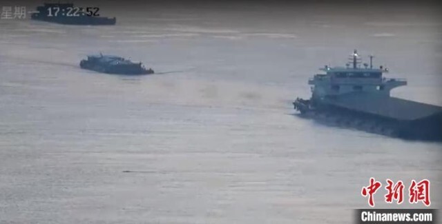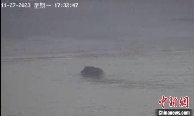 27日傍晚,南京海事局交管中心值班人员在通过长江三桥上的摄像头例行巡查时,意外地发现江面上有一头野猪在游泳。江苏海事局 供图
